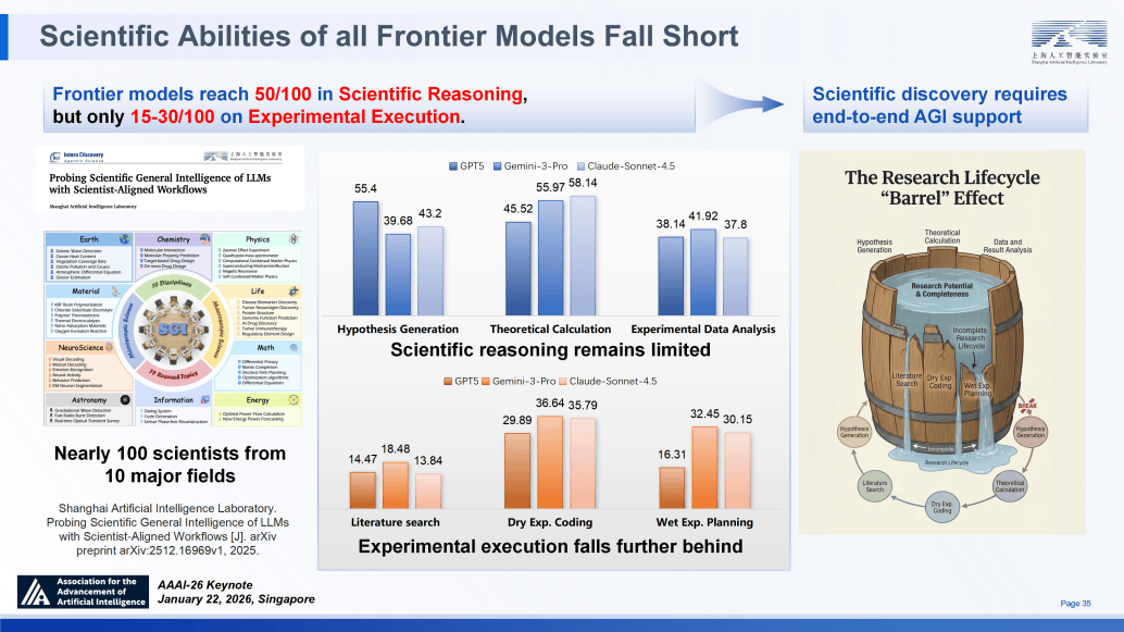 系统可以或许沉淀高阶研究模式、记实尝试细节并整合持久学问,展现了从数据到机制、从到验证的全流程智能化能力。正在生物医学范畴,SAGE 的底层努力于处理现有 LLM 将 “现实回忆” 取 “逻辑推理” 混合的问题。该方案正在长时程工致操做使命上,要处理科学发觉中的长链条推理问题,若何让通用模子不只正在单一使命上实现深度专精,拟合多个模态。模子正在超 1000 项专业使命(如逆合成阐发)中取模仿器进行交互进修,我们结合来自 10 个分歧科学范畴的 100 位科学家设想了评估系统!